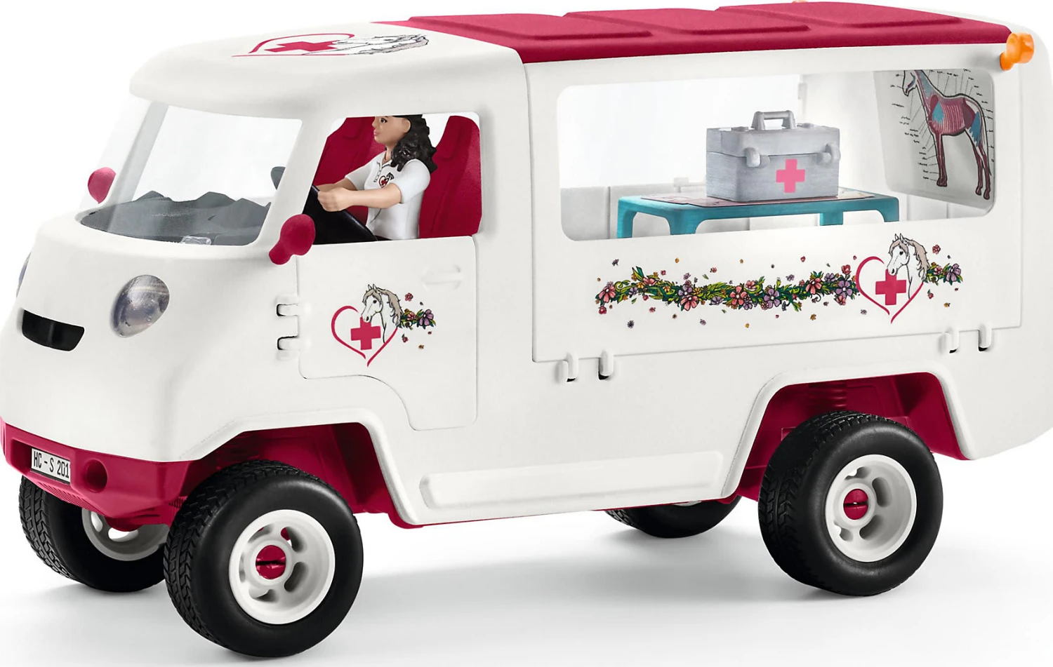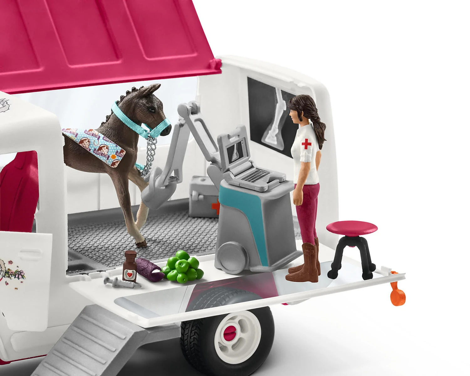 Das süße Hannoveraner-Fohlen hat sich verletzt, doch die mobile Tierärztin ist schon zur Stelle! Dieses umfangreiche Spielset aus der „Horse Club“-Kollektion von Schleich eignet sich klasse als Geschenk für alle kleinen Pferdefans. Die Tierärztin hat sich in ihrem Van eine kleine Praxis eingerichtet, sodass sie die Pferdchen direkt im Stall versorgen kann. Über die Rampe wird das verletzte Fohlen in die Praxis geführt und schon können die Untersuchungen beginnen. Die Ärztin macht Röntgenbilder, füttert dem Fohlen zur Beruhigung leckere Äpfel und findet gleich heraus, welche Stelle am Bein versorgt werden muss. Jetzt kommt eine Bandage an das verletzte Bein und eine Spritze lindert die Schmerzen. Dieses tolle Spielset kommt mit viel Zubehör und bietet Kindern jede Menge Spielmöglichkeiten!