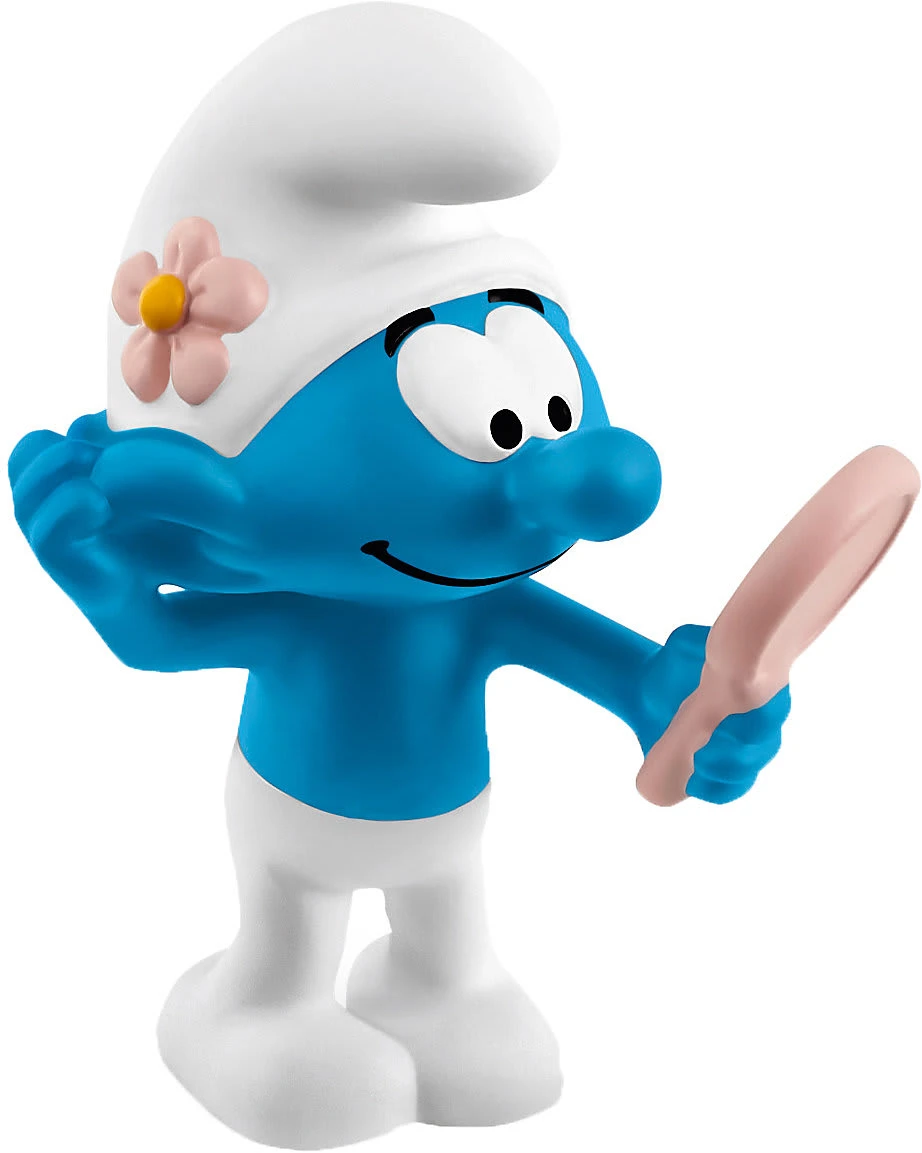 Freudig betrachtet sich der Beauty Schlumpf im Spiegel: Heute hat er sich besonders hübsch gemacht!